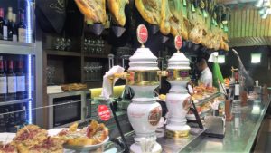 A speciality of northern Spain, these mainstays of the food scene are related to «tapas». Bigger than tapas, it is almost always served on a piece of bread with some tasty topping like fish (hake, cod or anchovy), tortilla, stuffed peppers or croquetas. Toothpicks hold it all together. That toothpick in the middle is a «pincho» or spike in Spanish…hence the name. They can become very elaborate and there are many local competitions to award prizes to the top creations. Unlike «tapas» however, «pintxos» are always served in individual portions and are paid for separately from the drinks. Life in Spain revolves around hanging out with friends and family, often in the street, drinking wine or beer and downing these little morsels. If you are in Pamplona on the Calle Estefeta, go to Bodegón Sarria. Great food, lively atmosphere, and directly on the street at the centre of the «Running of the Bulls» during the Festival of San Fermín.
